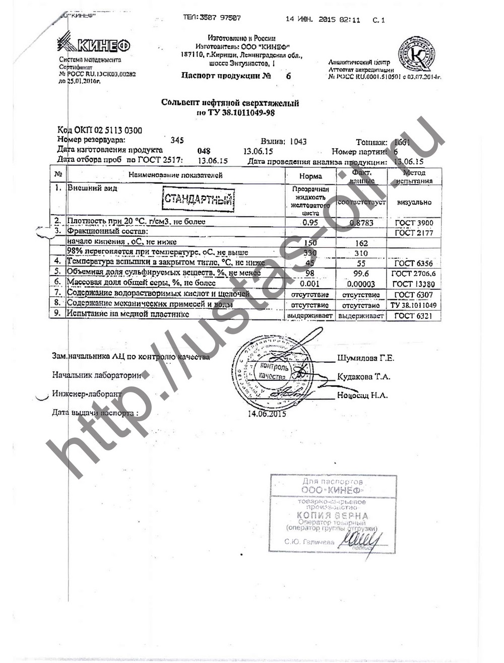 Продукт отгружается в ж/д цистернах (65 т) со ст.Кириши Ленинградской области.
