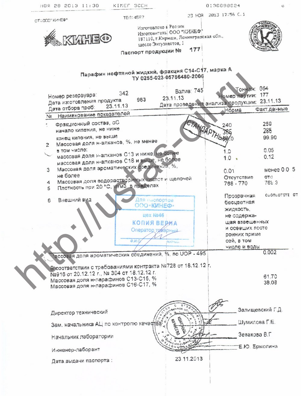 Парафин нефтяной жидкий, фракция С14-С17. Прозрачная жидкость, не содержащая взвешенных и осевших посторонних примесей, в т.ч. и воды. Продукт применяется для производства синтетических моющих средств, хлорпарафинов, высших спиртов и кислот, средства для розжига.